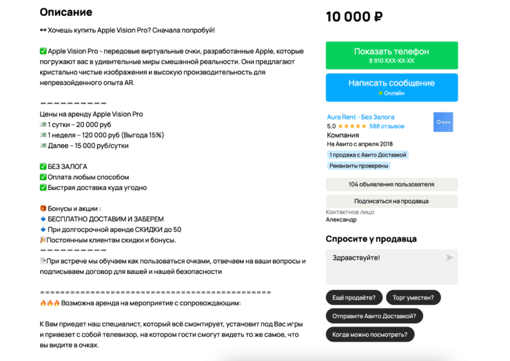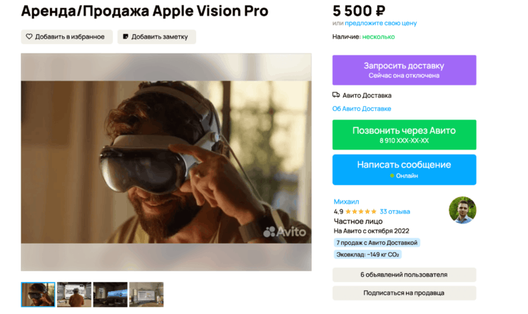 При желании попользоваться Apple Vision Pro поближе, вы можете взять ее в аренду на более длительный срок на возмездной основе. Такую услугу предлагают частные лица, о чем свидетельствуют объявления на Авито, коих за последнее время появилось довольно-таки немало.