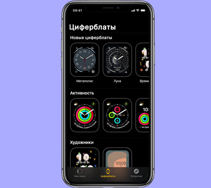 Циферблаты выбираются в отдельном разделе приложения Watch