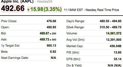Акции Apple подскочили в цене в четверг, капитализация компании выросла до 456 миллиардов долларов. Утром в четверг Microsoft стоила около 256,7 миллиарда долларов, а Google — около 198,9 миллиарда долларов. И когда акции Apple выросли более чем на три процента на утренних торгах, общая капитализация Google и Microsoft осталась позади.