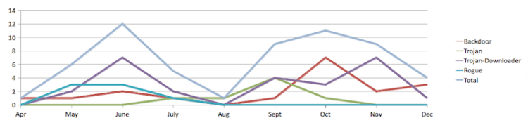 В сводке результатов указано, что в общей сложности в указанном периоде было 58 различных вариантов вредоносного программного обеспечения. Различных троянов-загрузчиков оказалось большинство (29 видов атак). Вторыми в «рейтинге популярности» оказались бэкдоры (было зафиксировано 15 различных видов).
