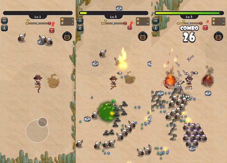 Любите игры на выживание? Тогда вам точно понравится Survival Riders! Ваш герой оказывается в пустыне, где его со всех сторон атакуют скелеты, змеи и другие враги. Цель проста: одолевайте противников, собирайте выпадающие из них драгоценные камни и прокачивайте способности. Таким образом у вас появится возможность продержаться в бою еще какое-то время.