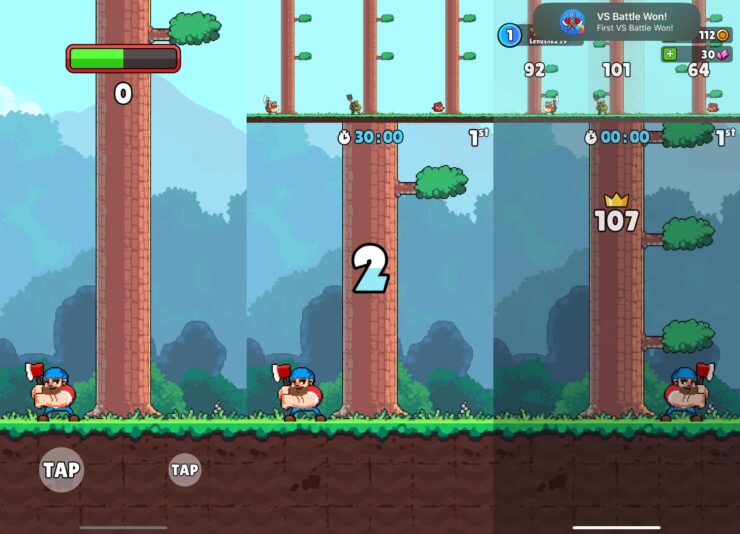 После того как я поиграл в стрельбу из лука с другими людьми, то думал, что ничего более эпичного в App Store уже не встречу. По крайней мере, не в этот раз. Как же я ошибался. Сразу же мне попалась на глаза игра Timberman 2. Из названия вы не сможете понять, что вам предстоит сделать, а это настоящее онлайн соревнование лесорубов. Вместе с тремя вашими соперниками вам необходимо на скорость рубить дерево.