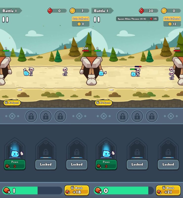 С каждым проигранным раундом вы будете накапливать деньги и сможете потратить их не только на прокачку скорости генерации еды, но и на количество жизней у здания или вообще на новых слаймов с новым видом оружия. Таким образом, со временем вы пройдете представленное поле и перейдете на следующее, где тоже, прежде чем победить противника, придется как следует прокачать свои способности. Это точно игра для терпеливых, но если разобраться в ее принципе, то она гарантированно вам понравится.