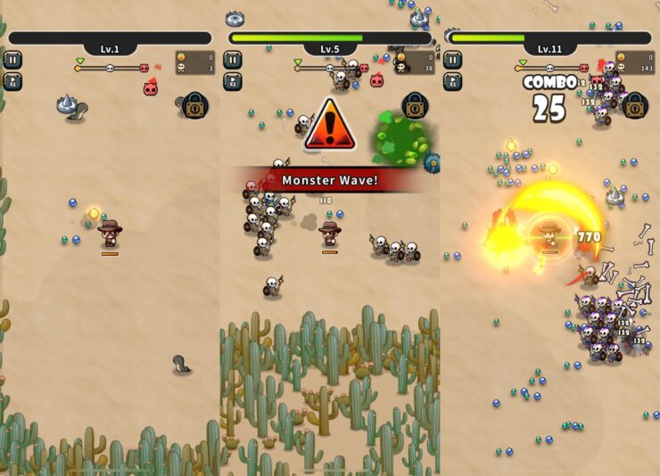 Для тех, кто любит игры на выживание, у нас тоже есть кое-что интересное. В игре Survival Riders ваш персонаж оказывается посреди пустыни, где со всех сторон на него будут нападать различные скелеты, змеи и прочие враги. Ваша задача — побеждать одного врага за другим, собирать выпадающие из них драгоценные камни и на них прокачивать свои способности.