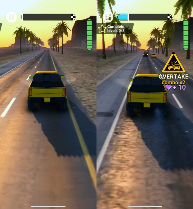 Чем больше попуток вы объедете за один раз, тем больше очков наберете. Со временем ваш автомобиль начнет все сильнее ускоряться, и придется проявить чудеса реакции. В игре очень простое управление: касайтесь экрана в момент обгона и убирайте его, чтобы вернуться в свою полосу. Очень удобно, что нет никаких лишних кнопок, которые могли бы мешать движению.