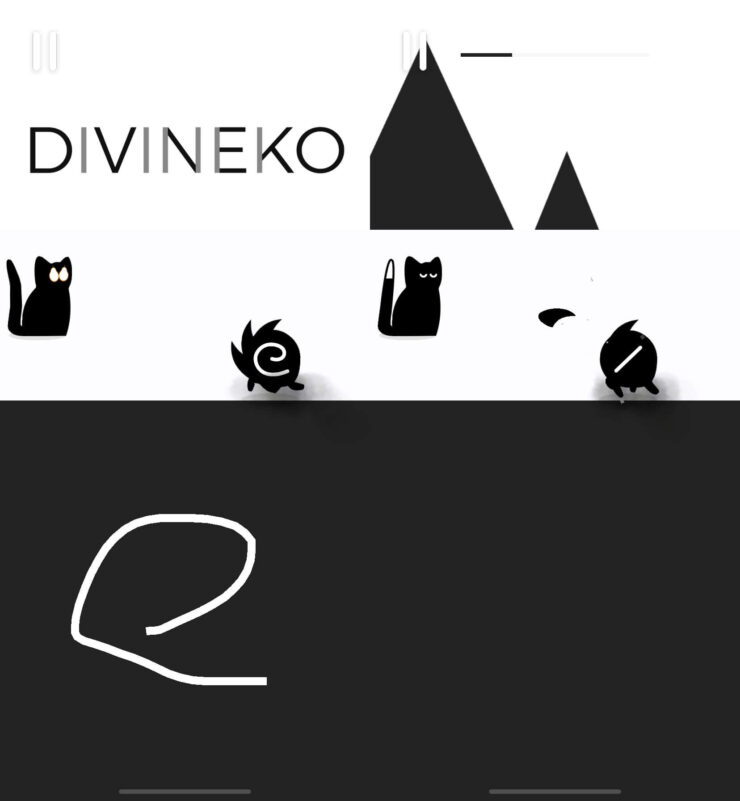 Удалось найти в App Store еще одну интересную игру для iPhone, которая легко затягивает интересным игровым процессом. В Divineko вам предстоит защищать кота от странных персонажей, которые стремятся его атаковать. Ваша задача — в нижней части экрана с помощью пальца изобразить такой же символ, как на врагах, и тогда они будут побеждены. Кажется, что это очень просто, однако некоторые противники после первого и даже второго символа показывают вам третий.