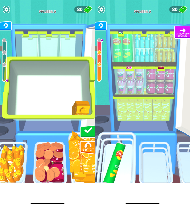 Есть у нас в арсенале еще одна прикольная игра, которая может вас удивить. Называется она «Холодильник». Как вы наверняка догадались по названию, вам предстоит заполнять холодильник различными продуктами. Вам дается несколько полных корзин с товарами и холодильник, разделенные на несколько секций. Чтобы получить за уровень три звезды, вам придется придумать, как разложить их все до единого.