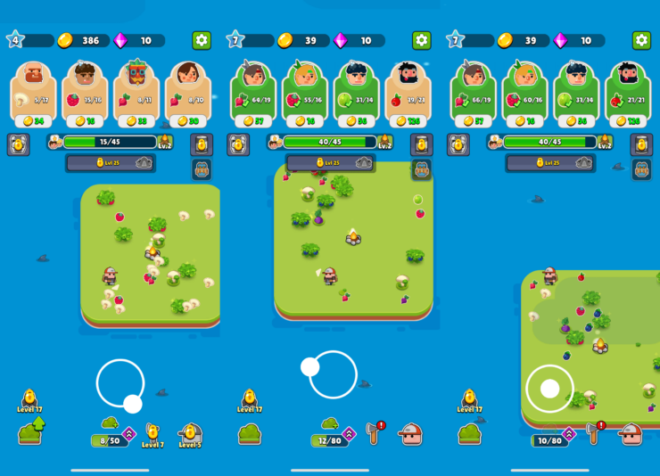 Ваша задача — собирать урожай, продавать его, зарабатывать деньги и прокачивать своего персонажа, увеличивать остров и в конце концов довести этот процесс до автоматизма. Весь игровой процесс в этом приложении максимально размеренный и зависит лишь от того, с какой скоростью вы сами заходите играть. Очень понравилось управление. Вам просто надо перемещать своего персонажа с помощью джойстика и периодически приобретать улучшения. Все остальное будет происходить автоматически. Скажу честно, потратил в этой игре целый час жизни, пока тестировал. Так сильно она меня затянула.