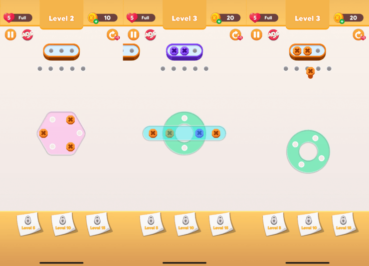 Таким образом вам предстоит проходить уровень за уровнем. В этой игре очень простое управление — достаточно просто тапать на тот болтик, который вы хотите выкрутить, и проблема сразу будет решена. По первым уровням может показаться, что игра очень простая, однако с каждым следующим раундом проходить ее будет все сложнее, и придется как следует подумать, прежде чем выполнить какое-то действие.