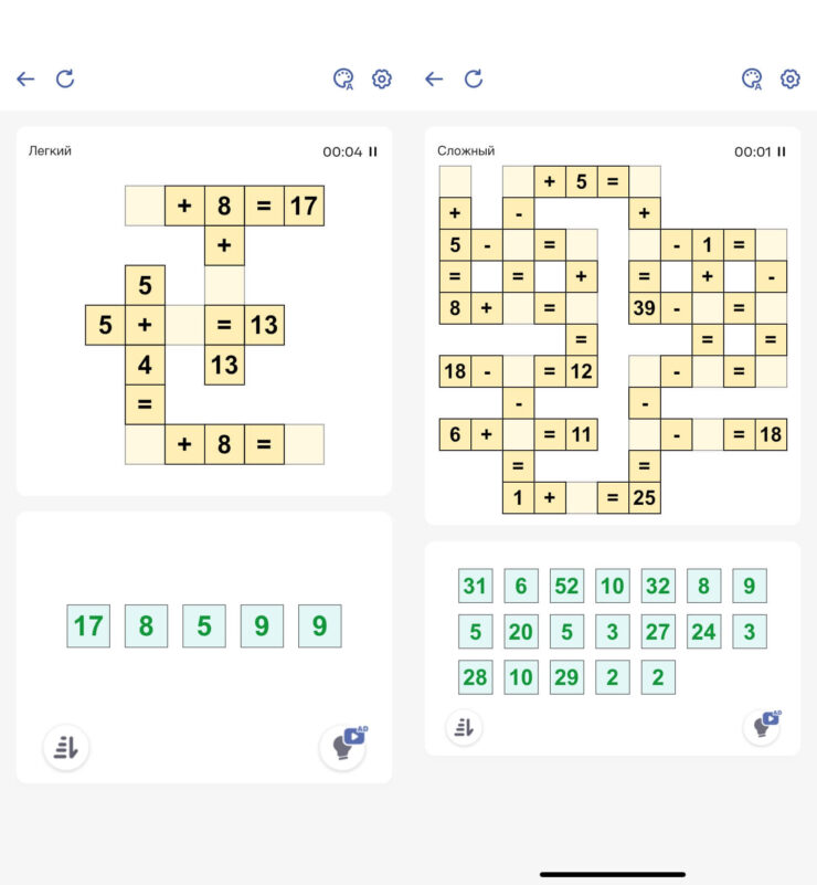 Сегодняшнюю подборку мы начнем с математической головоломки Cross Math. Вам даются различные примеры, расположенные в виде кроссворда. Но в них пропущено какое-то число. Необходимо правильно расставить цифры, чтобы действия выполнялись и по вертикали, и по горизонтали. Вроде бы ничего сложного. Но не забывайте про порядок действий. Умножение и деление выполняются в первую очередь и здесь уже могут начаться трудности.