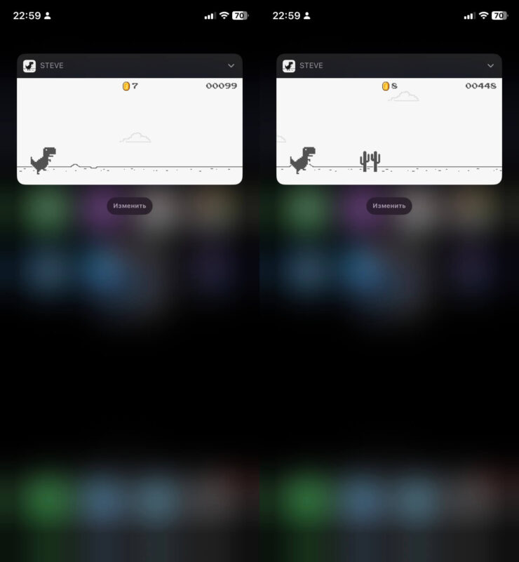 После старта игры динозаврик начнет бежать, а вам надо собирать монетки и перепрыгивать кактусы. Игра будет доступна в любой момент, и запускать отдельное приложение для этого вам не придется. Смахнули на экран с виджетами и спокойно наслаждаетесь игровым процессом.