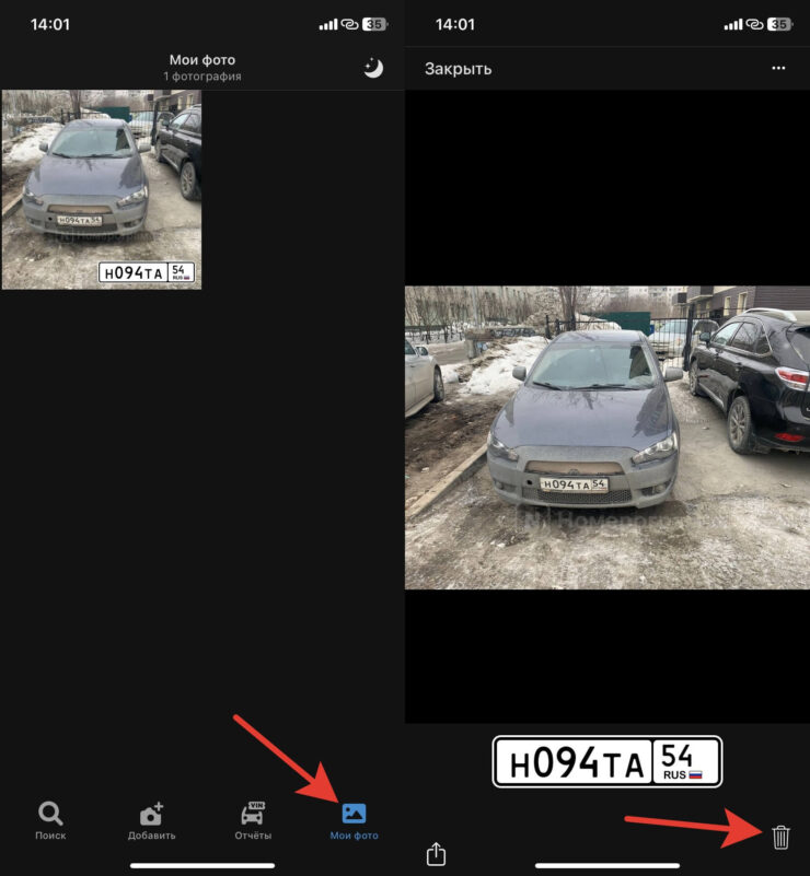Загруженные изображения можно без каких-либо проблем удалить из Номерограма. Для этого откройте вкладку “Мои фото”, нажмите на ошибочно загруженную картинку и коснитесь мусорного ведра в нижнем углу экрана.