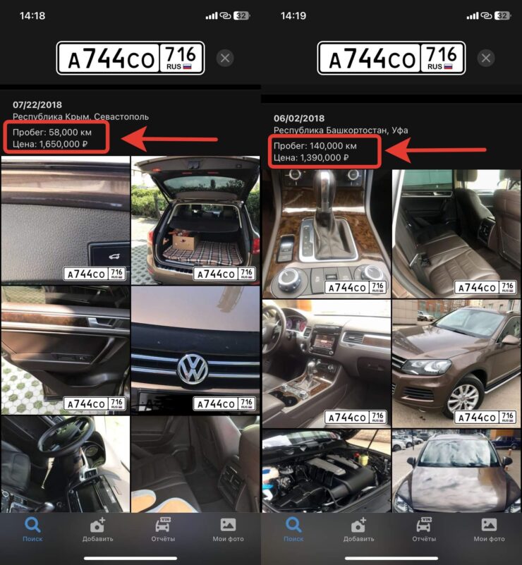Аналогично стоит задуматься и покупателю автомобиля с номером А744СО716. 2 июня 2018 года этот Touareg продавали в Республике Башкортостан с пробегом 140 000 км. А уже 22 июля того же года его выставили в Севастополе с пробегом 58 000 км. Даже скрученный пробег можно обнаружить с помощью Номерограма на iPhone.