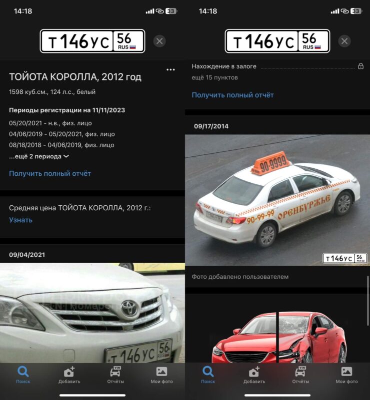 Все, что вам потребуется для использования приложения Номерограм на iPhone — это номер автомобиля, который вы хотите пробить. VIN, регистрационные документы или какая-то другая информация не понадобится. В базовом отчете вы получите информацию о количестве владельцев, сможете посмотреть фотографии, которые будут обнаружены в соцсетях или на каких-то сайтах и даже увидите объявления о продаже. Делается это следующим образом: