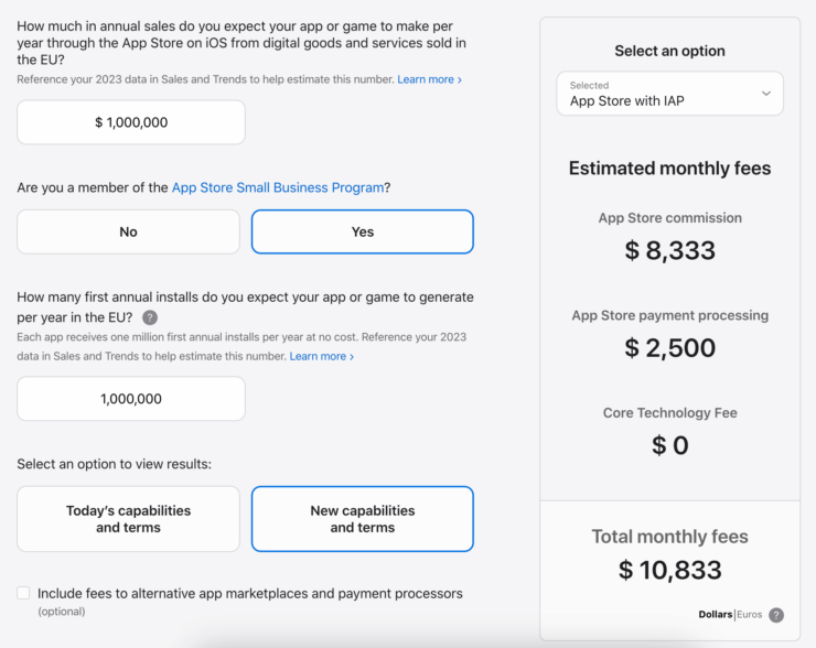 У Apple есть удобный калькулятор, который позволяет высчитать расходы разработчика на комиссии. Согласно его вычислениям, если приложение будет загружено 1 000 000 раз и принесет своему создателю 1 000 000 долларов или евро, то сбор Apple составит почти 1 300 000 долларов. В целом не так уж и катастрофично. Но при увеличении дохода и загрузок до 10 000 000, сумма сбора превышает уже 6 000 000 долларов. То есть Apple заберет у разработчика 60% его заработка. И это не считая налогов, которые ему придется заплатить в Европе.