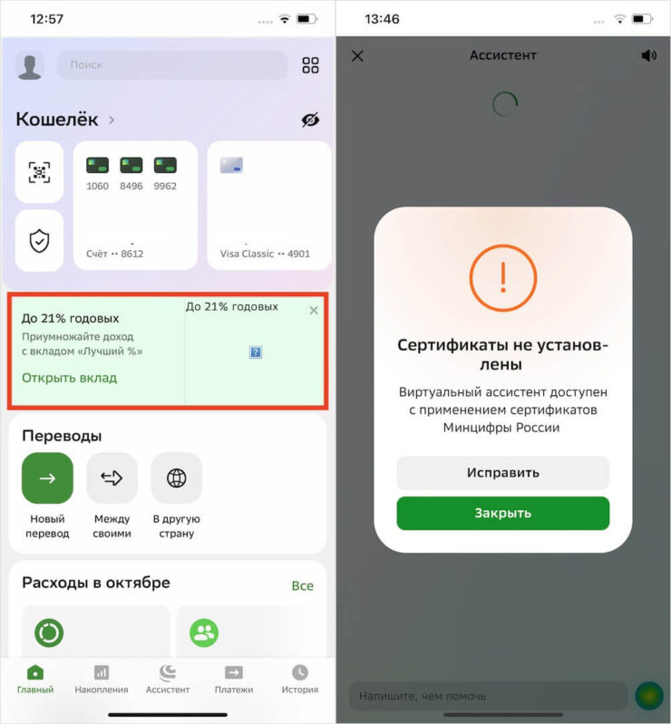 Поскольку PWA полностью дублирует оформление нативного приложения, вам будет доступен даже ассистент Сбера — Салют. Правда, чтобы он заработал, нужно установить сертификаты Минцифры. Без них помощник не заработает. Но, если установка ничего не изменила, очистите кэш браузера. Это должно помочь.