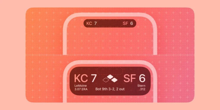 - Когда матч начнется, счет и эмблемы команд будут расположены с двух сторон от Dynamic Island, немного увеличив его размеры вправо и влево.