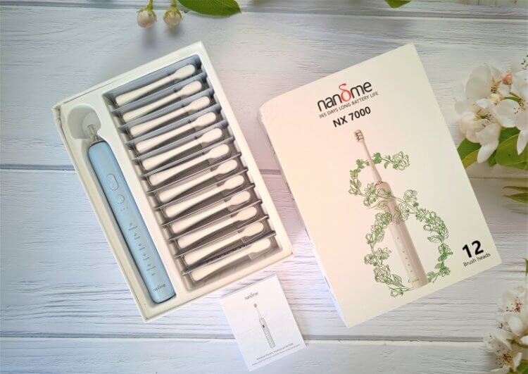 Но и это еще не все, чем может удивить Nandme NX7000. В комплекте с зубной щеткой идет двенадцать насадок! Чтобы вы понимали, стоматологи рекомендуют менять насадку каждые три месяца. Получается, что такого количества вам хватит на три года использования. Целых три года вам не придется думать о том, где взять насадку и стоит ли ее менять. Просто спокойно переставляете ее в нужное время и продолжаете пользоваться. На самом деле это очень круто, когда все сразу идет в комплекте.
