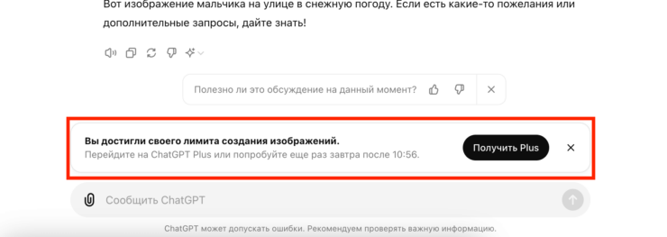 OpenAI невыгодно делать подобные инструменты полностью безлимитными. Надо же как-то подталкивать пользователей нейросети ChatGPT к оформлению платной подписки. Именно там вы получите доступ к рисовалке DALL-E 3 без каких-либо ограничений. С другой стороны, многим хватит и двух картинок в день, особенно если генерирует она их быстро и качественно.