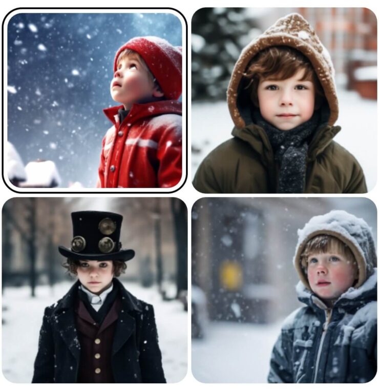 ChatGPT и Kandinsky сделали по одной в целом близкой друг к другу картинке. Вот только первый добавил на изображение больше мелких деталей, что делает его несколько интереснее. Нейросеть YandexART нарисовала сразу четыре картинки, но все они какие-то уж очень кошмарные. Мне совсем не понравилось то, что сделал Яндекс. Следом всем трем тестируемым нейронкам было предложено изобразить мальчика на улице в снежную погоду, и вот тут все показали свои умения во всей красе: