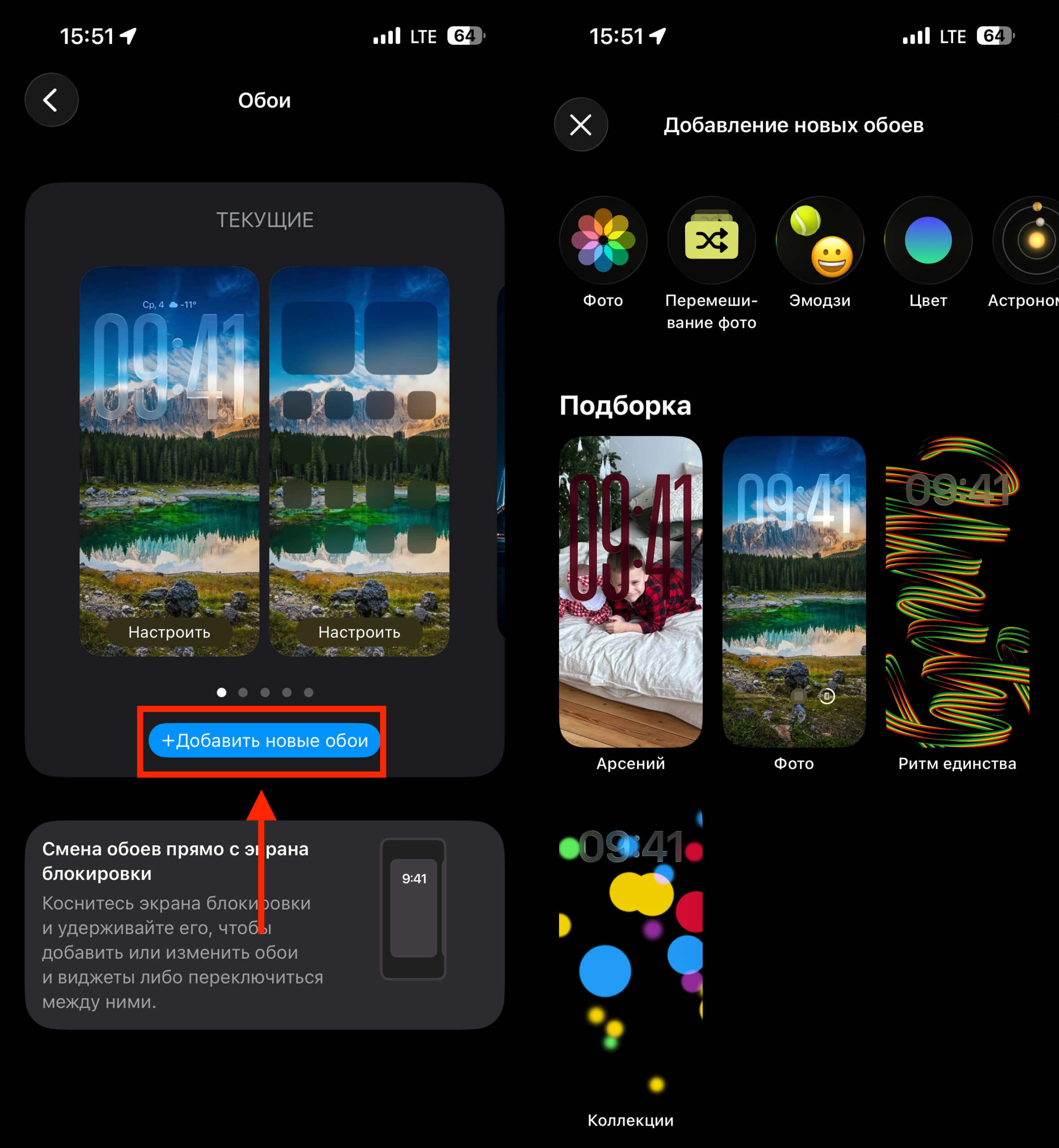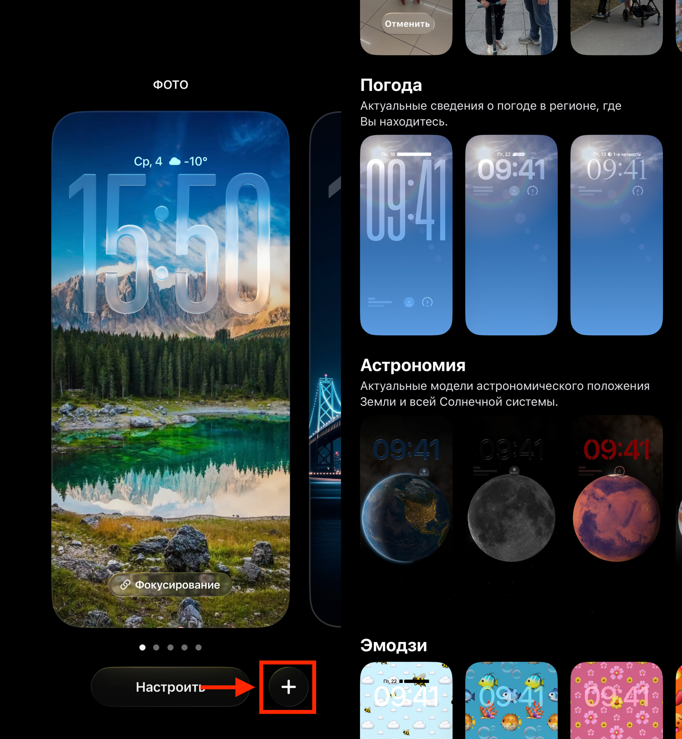 Начиная с iOS 16 Apple добавила отдельный интерфейс для настройки локскрина. Через него можно не только поставить обои на Айфон, но и изменить шрифт часов, добавить виджеты и создать несколько экранов блокировки. Этот способ удобен тем, что вы сразу видите, как будут выглядеть новые обои на iPhone. Можно быстро переключаться между вариантами, менять изображения и настраивать элементы интерфейса.