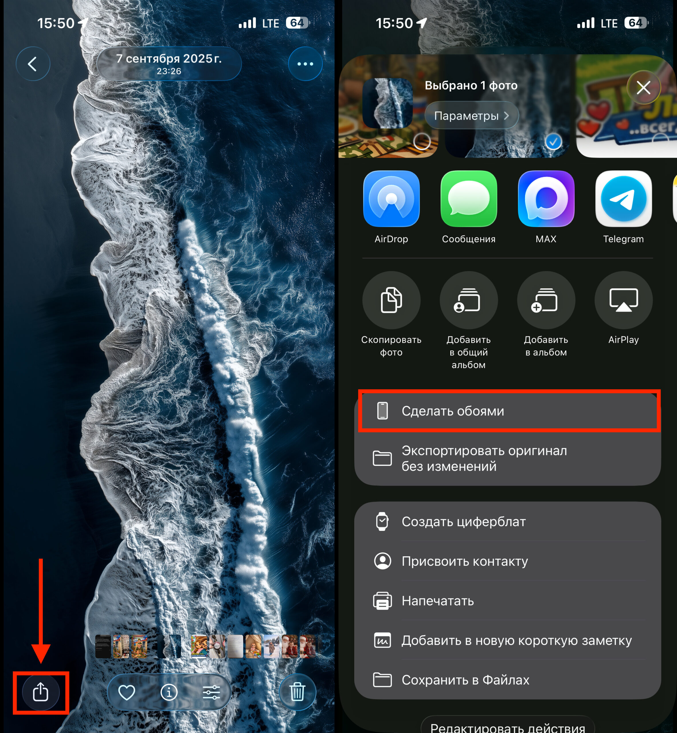 Иногда пользователи даже не подозревают, что можно установить фото на обои прямо из галереи без перехода в настройки системы. Достаточно открыть изображение и воспользоваться кнопкой «Поделиться». После этого система предложит сразу применить его как фон. Чтобы установить обои на iPhone через приложение «Фото», сделайте следующее: