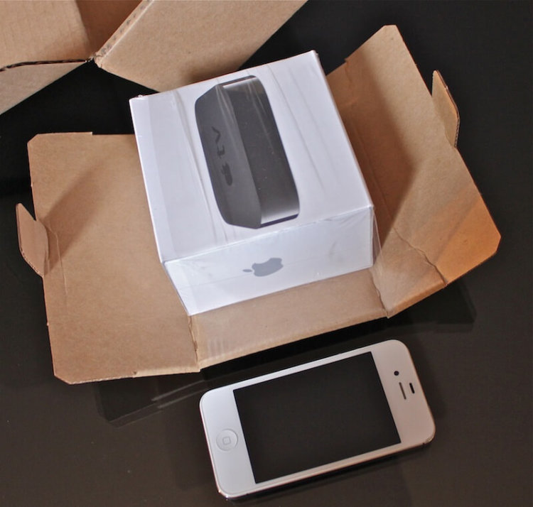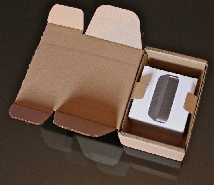 Упакована приставка Apple TV в маленькую коробку, которая размерами ненамного превосходит размеры устройства. Эта коробка находится внутри еще одной, более объемной картонной коробки. Внутри нее положены сетевой кабель питания (в устройстве есть свой блок питания), пульт дистанционного управления, вводная инструкция, и сама маленькая черная приставка, завернутая в целлофан, скрепленный скотчем, для защиты глянцевой черной поверхности. В упаковку не входит ни кабель HDMI для подключения к телевизору HDTV, ни Ethernet-кабель (хотя Apple TV прекрасно работает и посредством беспроводных соединений).