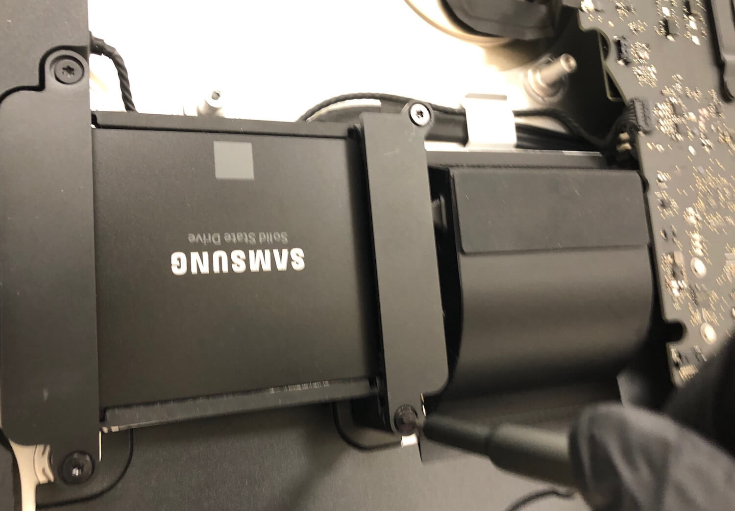 Так просто к памяти не добраться. Сперва демонтируют вентилятор и накопитель — в этом iMac его как-то уже меняли на SSD.