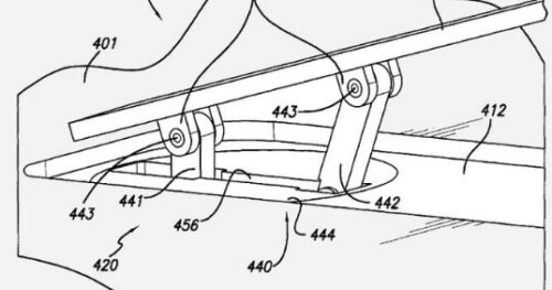 Запатентованный элегантный аксессуар позволит расположить iPad таким образом, чтобы было удобнее пользоваться виртуальной клавиатурой устройства. Изобретателями являются Стивен Макклар (McClure) и Джошуа Бэнко (Joshua Banko). Заявка на этот патент была представлена к рассмотрению в Бюро США по патентам и торговым маркам в третьем квартале 2009 года.