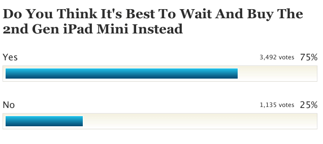 По данным одного из опросов на Cult of Mac, 75 % покупателей решили не покупать сейчас iPad mini, а подождать его обновление. С чем связано такое решение? Во многом потому, что у младшего планшета нет Retina-дисплея, к которому очень привыкли обладатели iPad третьего поколения. Также некоторые считают, что лучше покупать mini только тогда, когда он будет оснащен процессором A6X, который сейчас стоит на iPad 4. И, конечно же, многих не оставляет надежда, что второе поколение iPad mini будет легче, тоньше, быстрее (хотя куда уже легче?), как это случилось с самым первым iPad.