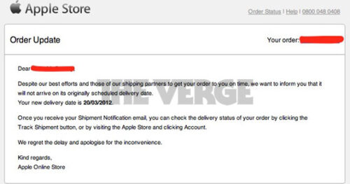 В Великобритании были получены письма от Apple с тем, что новый iPad не придет в поставленные сроки 16 марта, «несмотря на усилия[Apple] и [ее] партнеров по отгрузке». Источник сообщил, что обновленной датой поставки стал следующий вторник, 20 марта, но детальное исследование показало, что некоторые люди получат новинки аж 21 марта.