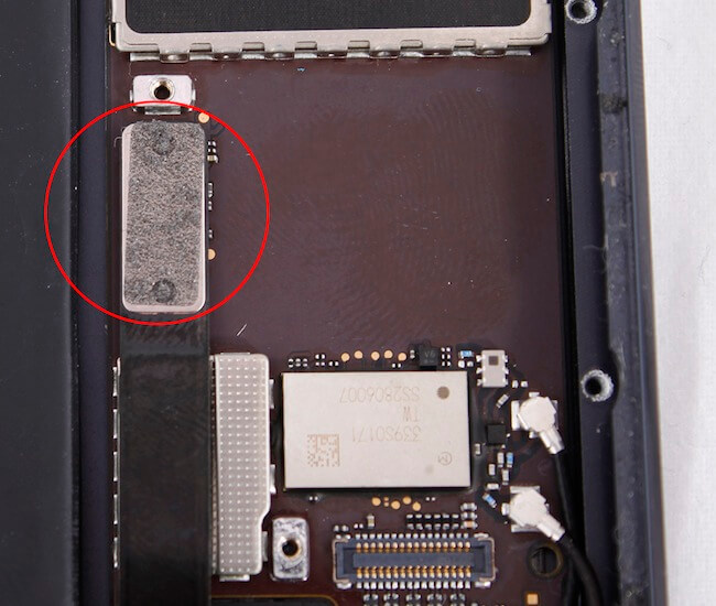 Откручиваем 4 болта Lightning-коннектора и извлекаем левый динамик. ВНИМАНИЕ! Динамики соединяются с материнской платой специальной металлизированной клейкой лентой. Ни в коем случае ее не повредите, иначе получите «мертвые» динамики. Достать подобную ленту крайне проблематично.