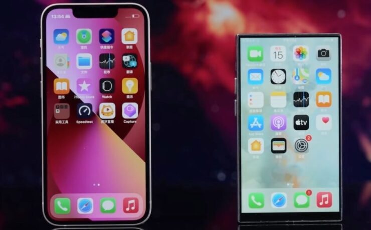 Впрочем, судя по всему, аппарат работает довольно сносно. Он отлично воспринимает нажатия и весьма быстро перемещается по интерфейсу. Особенно удивляться тут, конечно, нечему, потому что неизвестно, как аппарат бы повёл себя в реальной жизни. Однако можно заметить, что преобразования негативно сказались на его толщине. Он выглядит минимум раза в 1,5 толще, чем iPhone 12 или 13. Это не очень хорошо. Но в целом воспринимается как логичная жертва.