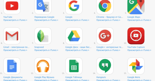 Кликаем по ссылке «iOS» — и открывается специальная страница в App Store, на которой предложены все приложения от Google, выпущенные для мобильной платформы Apple. Каждая программа имеет свой номер, и если нумерация каким-то образом связана с популярностью, то можно заключить, что главным iOS-хитом от Google является приложение YouTube. Это неудивительно, если учесть, что после исчезновения этой программы из базового набора iOS пользователи по инерции продолжают ее устанавливать на новые устройства.