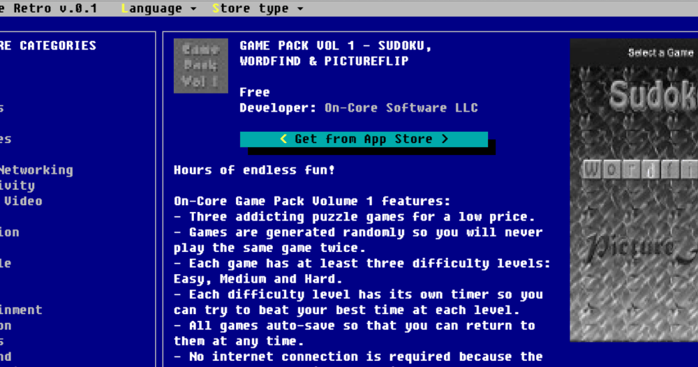 Как гласит пословица — лучше один раз увидеть, чем сто раз услышать, поэтому долго растекаться словами по экрану не будем. Взгляните на скриншот и переходите на страницу ретро-магазина. Есть поддержка русского языка и возможность переключения между магазинами от Apple и Google. Для удобства лучше всего повернуть смартфон в альбомную ориентацию.