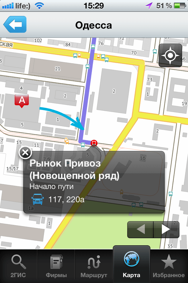 Еще одно немаловажное преимущество — удобный и быстрый интерфейс, полностью совпавший с моим внутренним ощущением «как это должно быть», а благодаря возможности загрузить карту полностью на устройство (а почему нет-то, если карта Одессы занимает где-то 10 мегабайт), 2ГИС кажется метеором на фоне других картографических сервисов, требующих подгрузки данных из Интернет (пользуясь случаем, передаю лучи икоты ОпСоСам с их роуминговыми тарифами на передачу данных). Собственно, работа с картами 2ГИС в корне отличается от привычного «что-то подвинули/изменили масштаб, и сидим ждем пока загрузятся квадратики карты». Тут вся карта у вас на устройстве, поэтому ее можно как угодно крутить, масштабировать, двигать и изучать. Конечно, у других картографических сервисов уже тоже заметно движение в сторону офлайна, но во-первых, пока что в основном это не касается iOS, а во-вторых, растровые карты занимают кучу места на устройстве.