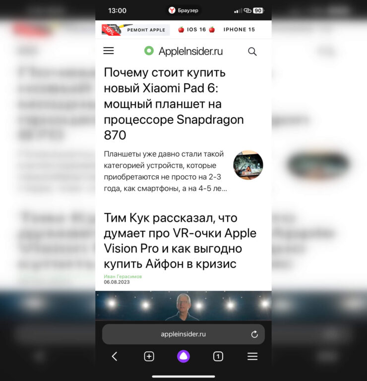 Есть у Яндекс Браузера и еще один существенный недостаток, с которым я никак не могу смириться. Это строка поиска и ввода адреса, которая находится внизу страницы. В Google Chrome такой эксперимент признали неудачным и отказались от него, а Сафари позволяет переместить ее вверх. С одной стороны, если у вас Айфон с большим экраном, то ввод поискового запроса внизу должен, наоборот, добавить удобства. Но привыкнуть к такому решению у меня не получается.