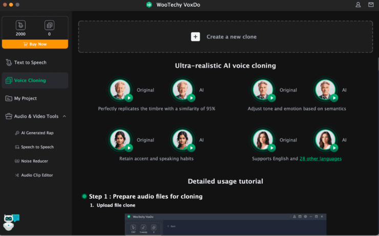 - В приложении WooTechy VoxDo выберите раздел «Voice Cloning». При желании здесь же можно прослушать образцы того, как программа генерирует голос;