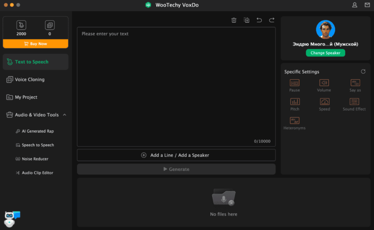 Сразу после запуска приложения WooTechy VoxDo вас встречает простой и понятный интерфейс. По умолчанию в приложении открывается раздел «Текст в речь». По центру экрана располагается поле для ввода текста, а в левой части — настройки. Вы можете выбрать одного из предустановленных спикеров, отрегулировать громкость, скорость речи, дополнительные звуковые эффекты и многое другое.