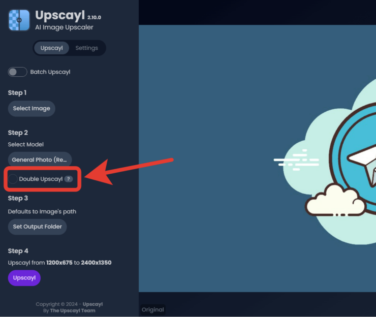 - Поставьте галочку на пункт “Double Upscayl” или перейдите на вкладку “Settings”;