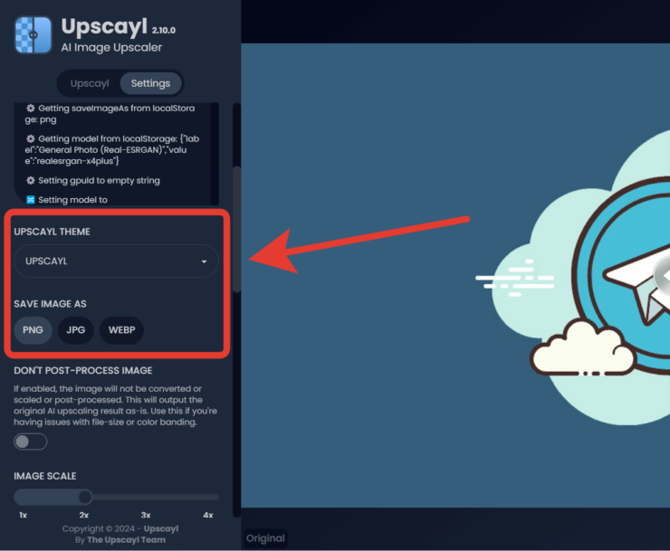 - Пролистайте немного вниз, и в блоке “Upscayl Theme” можете настроить удобную тему оформления;