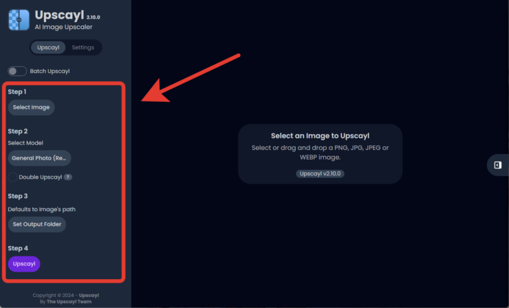 - В разделе “Step 2” необходимо выбрать используемую модель апскейла. Оставьте пока значение по умолчанию, так как вы еще не видели, как работает приложение;