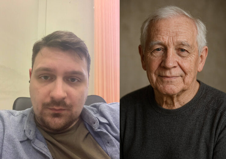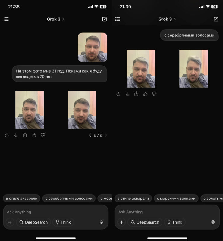 Давайте теперь попробуем состарить ту же самую фотографию. Возьмем те же три нейросети: Grok, бесплатный и платный ChatGPT. Теперь задание будет интереснее: я обозначил, что на фото мне 31 год, и попросил показать, как я буду выглядеть в 70 лет.