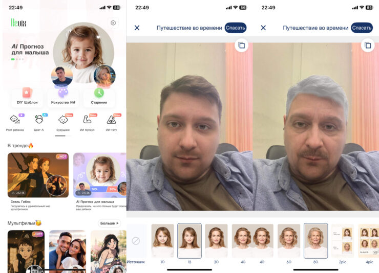 Как видите, с точки зрения состаривания и омоложения особенно рассчитывать на популярные нейросети не стоит. Даже в платной версии результат получается зачастую слишком далек от оригинала, и узнать себя на этой фотографии сможет не каждый. Поэтому обратимся к специализированным приложениям, которых в App Store для iPhone огромное количество. Для начала давайте посмотрим на Revix. Разработчики заявляют, что обработка фотографий здесь происходит с помощью искусственного интеллекта. Собственно говоря, это нам и надо, поэтому смело тестируем: