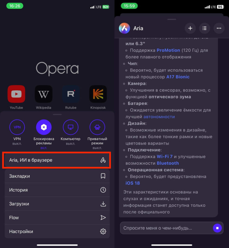 А вот с ответами, которые дает нейросеть, всё не очень однозначно. Я попросил Aria рассказать про Айфон 16, и она собрала очень неоднозначную информацию. Во-первых, ИИ решил, что базовый iPhone 16 получит увеличенную диагональ дисплея до 6,3 дюйма с высокой частотой обновления 120 Гц. Во-вторых, Aria считает, что iPhone 16 будет оснащен процессором Apple A17. Даже не Pro, а неким обычным. Как вы уже знаете, ничего этого в базовых Айфонах не будет. Так что доверять информации, которую представляет ИИ Aria, не стоит, и ее надо перепроверять.