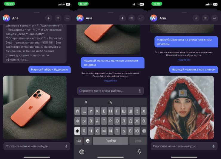 Крупные разработчики браузеров для iPhone продолжают планомерно совершенствовать свои приложения и делать их лучше. Так, Опера выпустила новую версию своего браузера Opera One. Он получил встроенный искусственный интеллект Aria с возможностью генерации изображений. С помощью него вы сможете не только намного быстрее находить нужную информацию, но и создавать какие-нибудь необычные картинки. Самое интересное, что все это достаточно неплохо работает на русском языке и не требует от вас каких-то сложных манипуляций.
