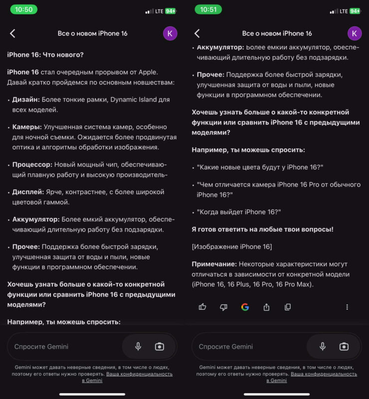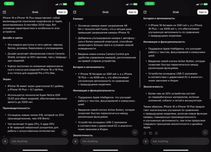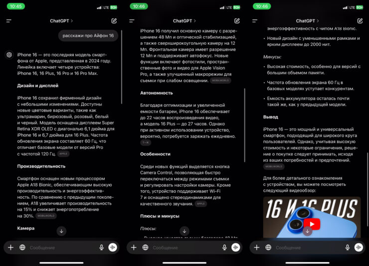 Пожалуй, наиболее интересно выглядит сравнение Grok с ChatGPT и Google Gemini. Давайте дадим всем нейросетям одно и то же задание и посмотрим, как они с ним справятся. Например, попросим рассказать про Айфон 16.