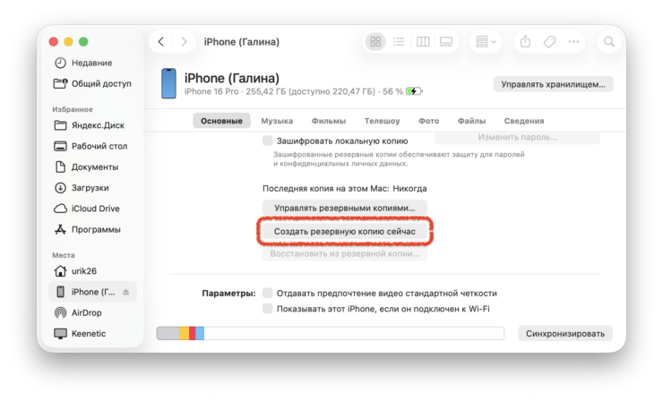 На Mac с macOS Catalina и новее резервные копии создаются через Finder. Подключаете iPhone или iPad кабелем, выбираете устройство в боковой панели и нажимаете «Создать резервную копию». На Windows — через приложение Apple Devices (раньше это был iTunes, но Apple наконец-то избавила нас от него).