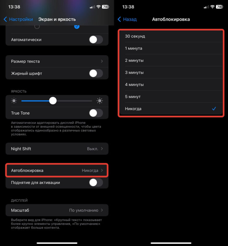 У меня автоблокировка на Айфоне всегда отключена, так как мне удобнее самому контролировать этот параметр. Возможно, что вам тоже хотите так сделать, поэтому просто переставьте галочку в автоблокировке на “Никогда”. Только имейте в виду, что это может привести к повышенному расходу аккумулятора.