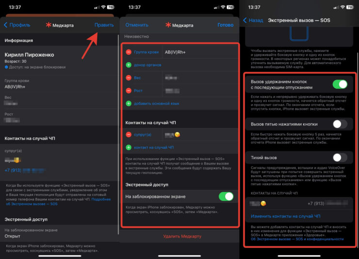 Теперь достаточно пять раз нажать на кнопку блокировки, и появится возможность открыть медкарту, даже не заходя в Айфон. Отсюда же можно совершить звонок человеку, которого вы указали в качестве контакта на случай ЧП.